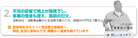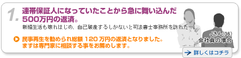 これには、「民事再生」手続きが作られた経緯が関係してきます。つまり、「民事再生」手続きは住宅ローンに追われ、「自己破産」する人達が増えてきたため、そのような人々を救済するためにできた制度であると考えます。もちろん、心情的にどうしても「自己破産」したくないという依頼者には、「民事再生」手続きを勧めることはありますが、本音は、住宅ローンがあり、その他の借金を整理(5分の1にする)すれば生活が成り立っていく方々にのみ、お勧めしたい手続きなのです |
